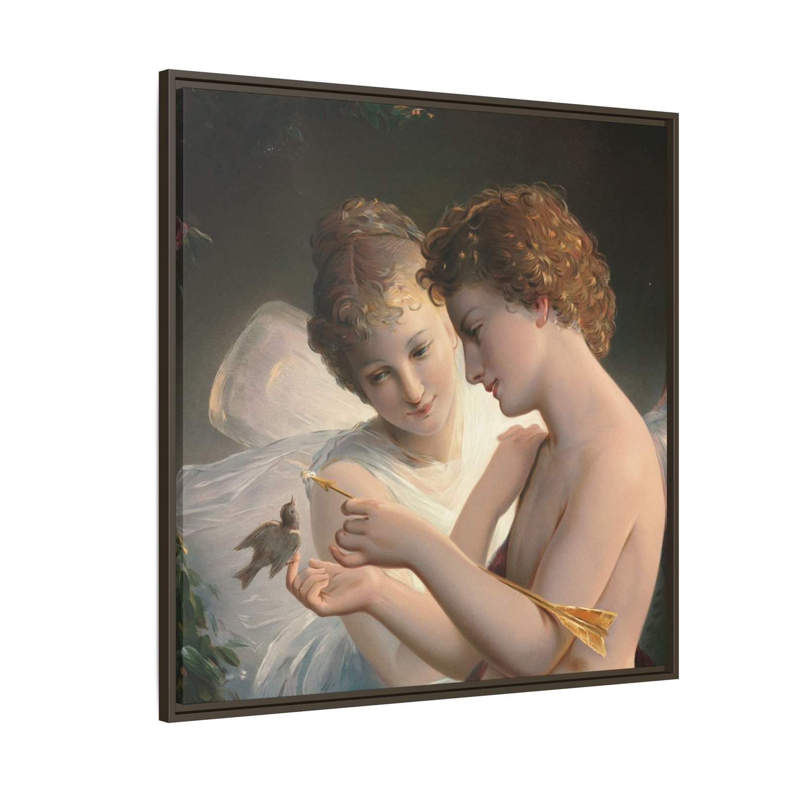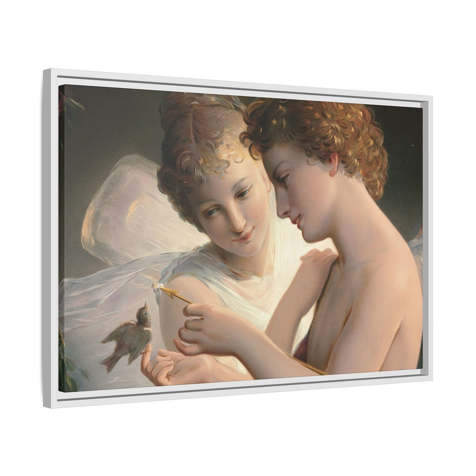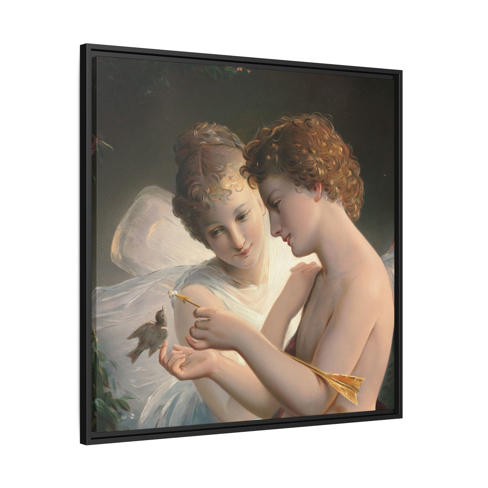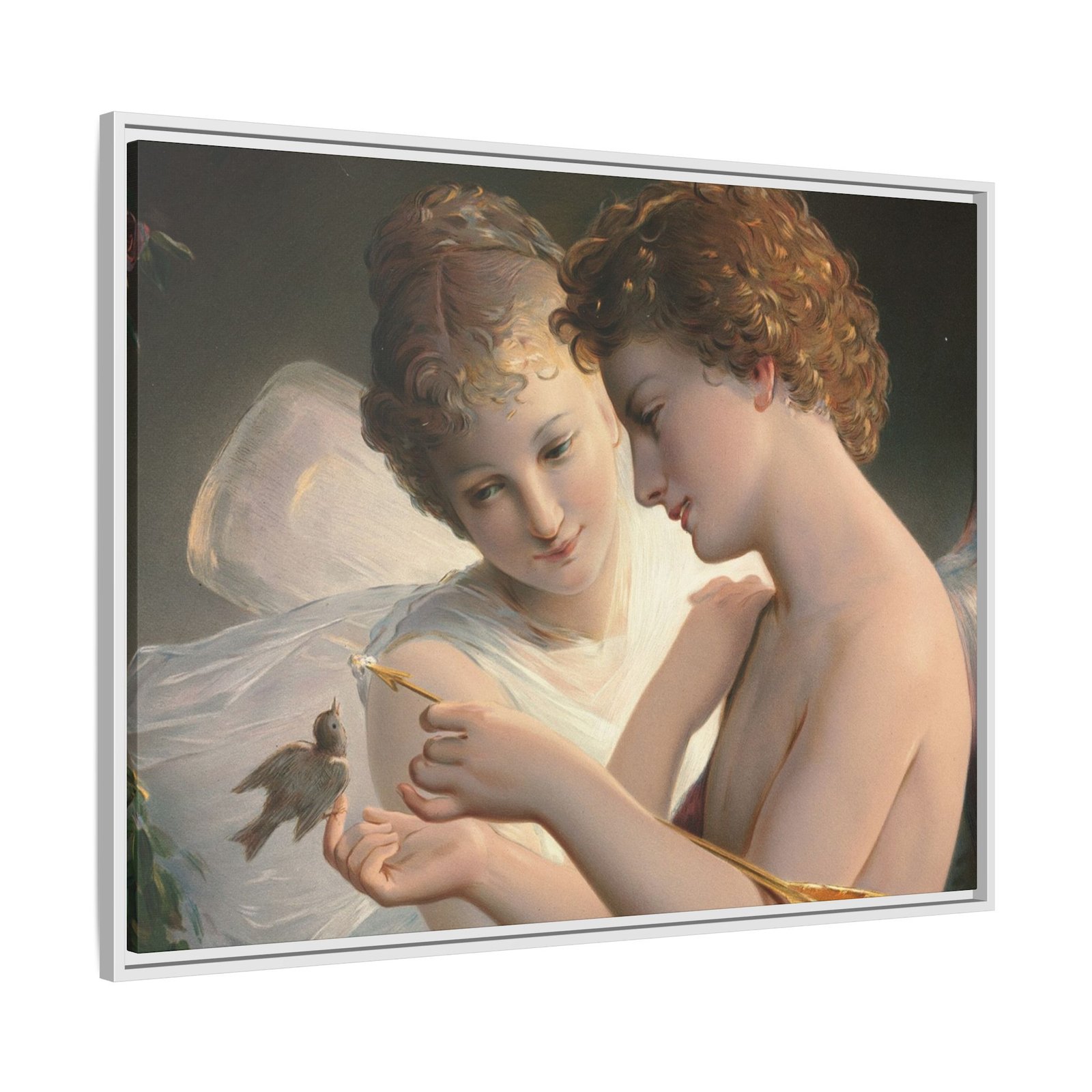 Две крылатые фигуры нежно держат маленькую птицу среди пышной зелени и цветущих роз. Их мягкие выражения лиц и лёгкие, струящиеся одежды создают спокойную и интимную атмосферу.