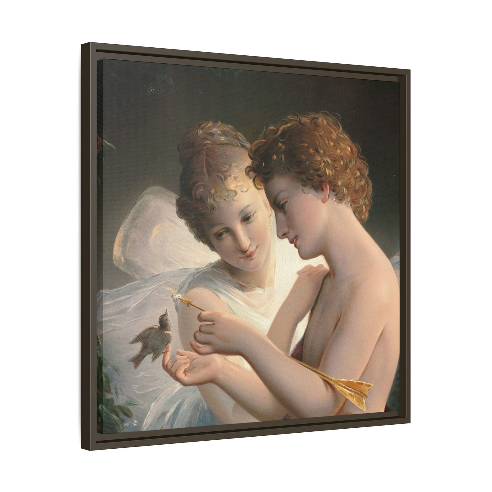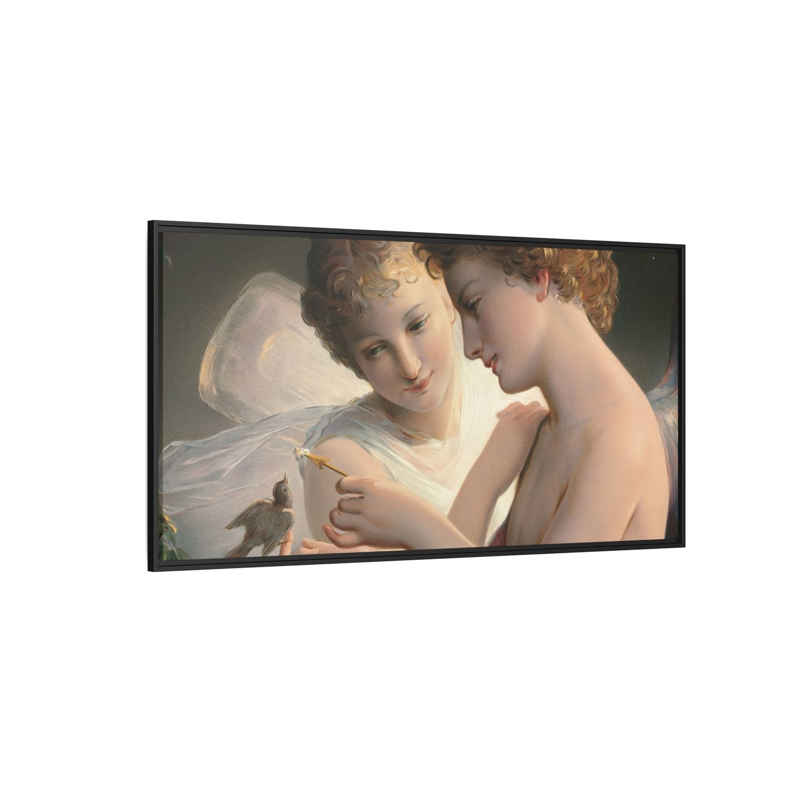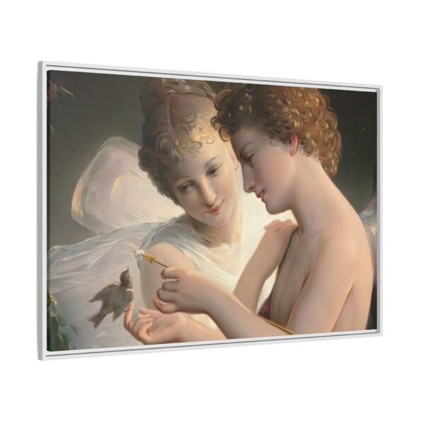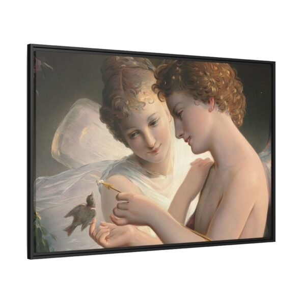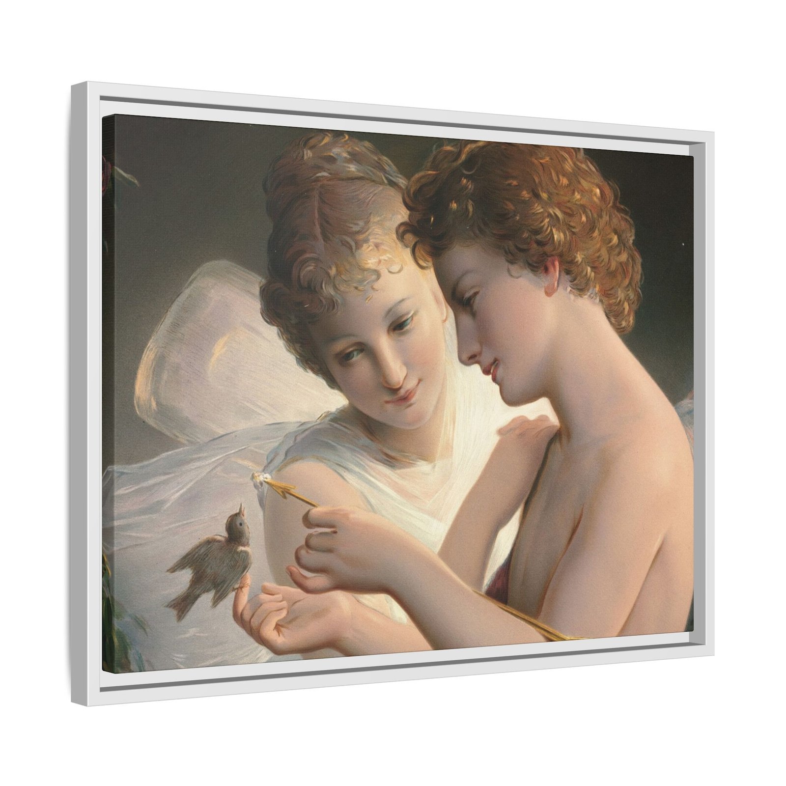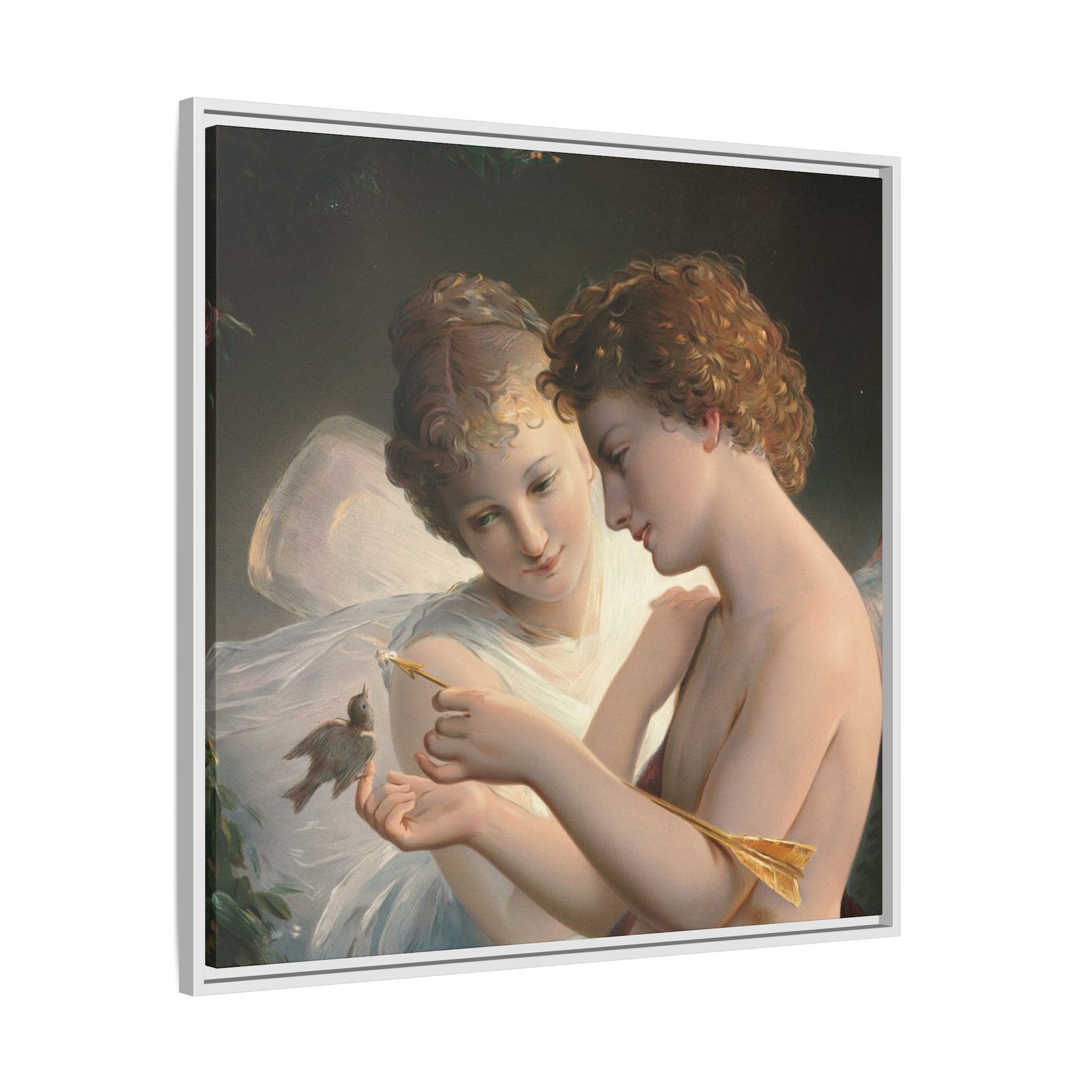 Две крылатые фигуры нежно держат маленькую птицу среди пышной зелени и цветущих роз. Их мягкие выражения лиц и лёгкие, струящиеся одежды создают спокойную и интимную атмосферу.