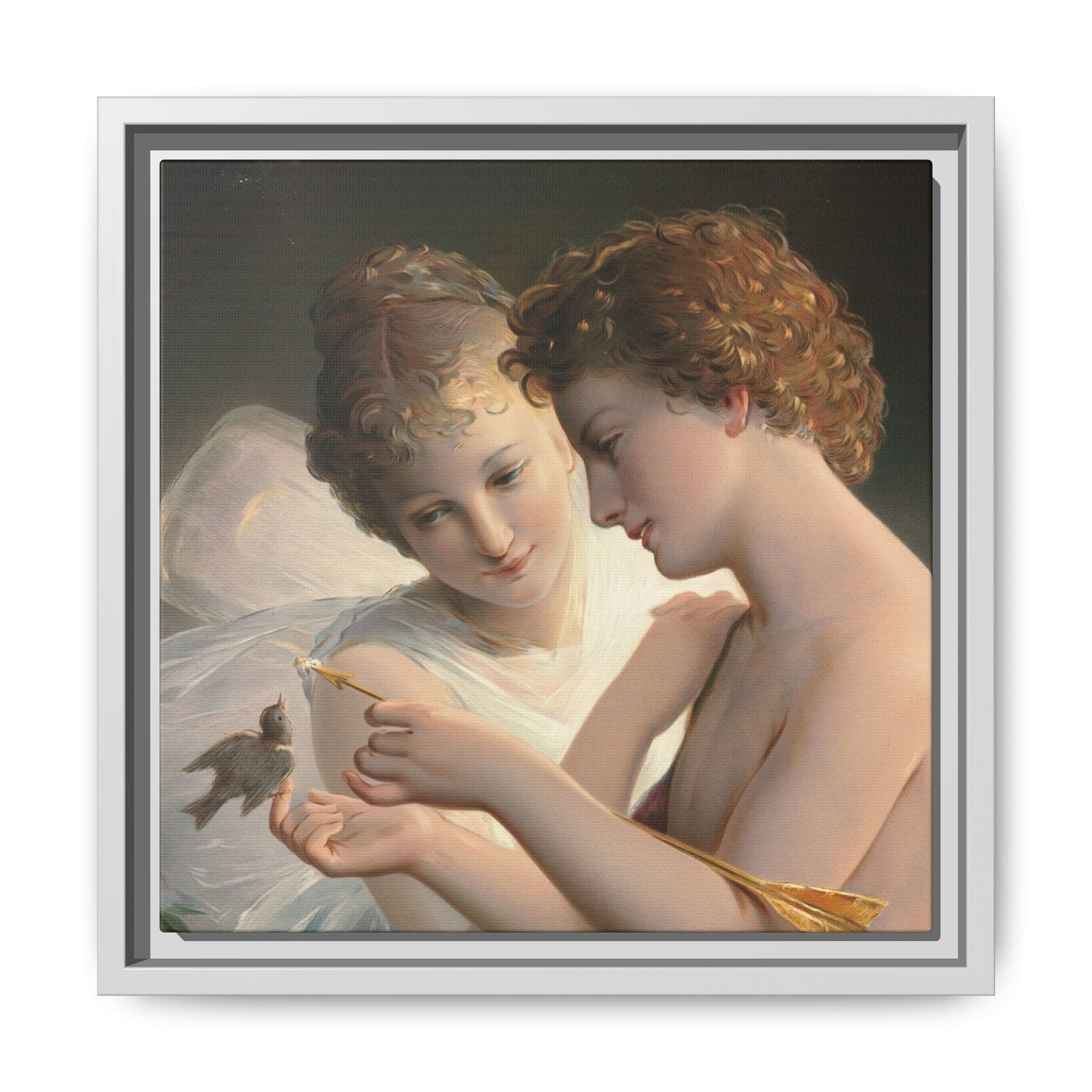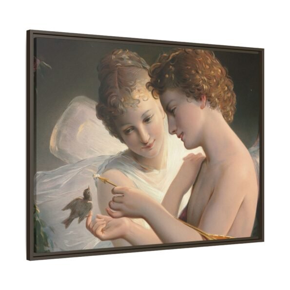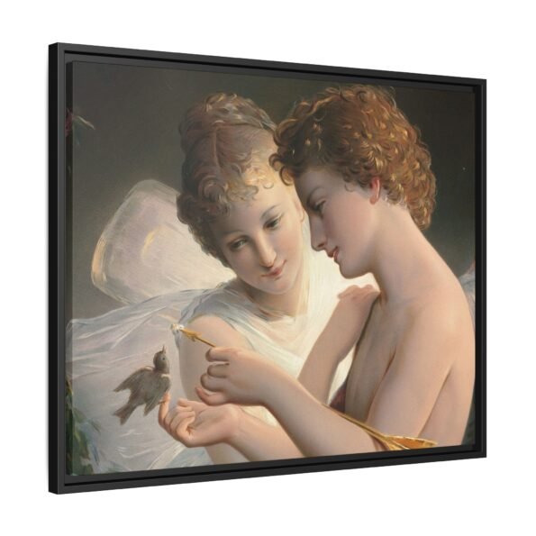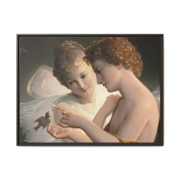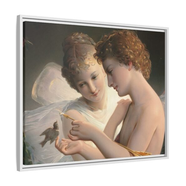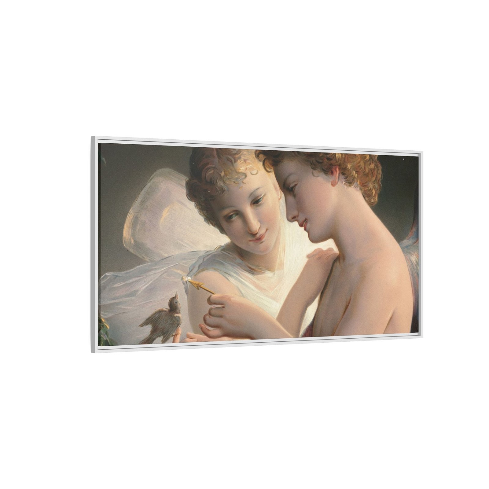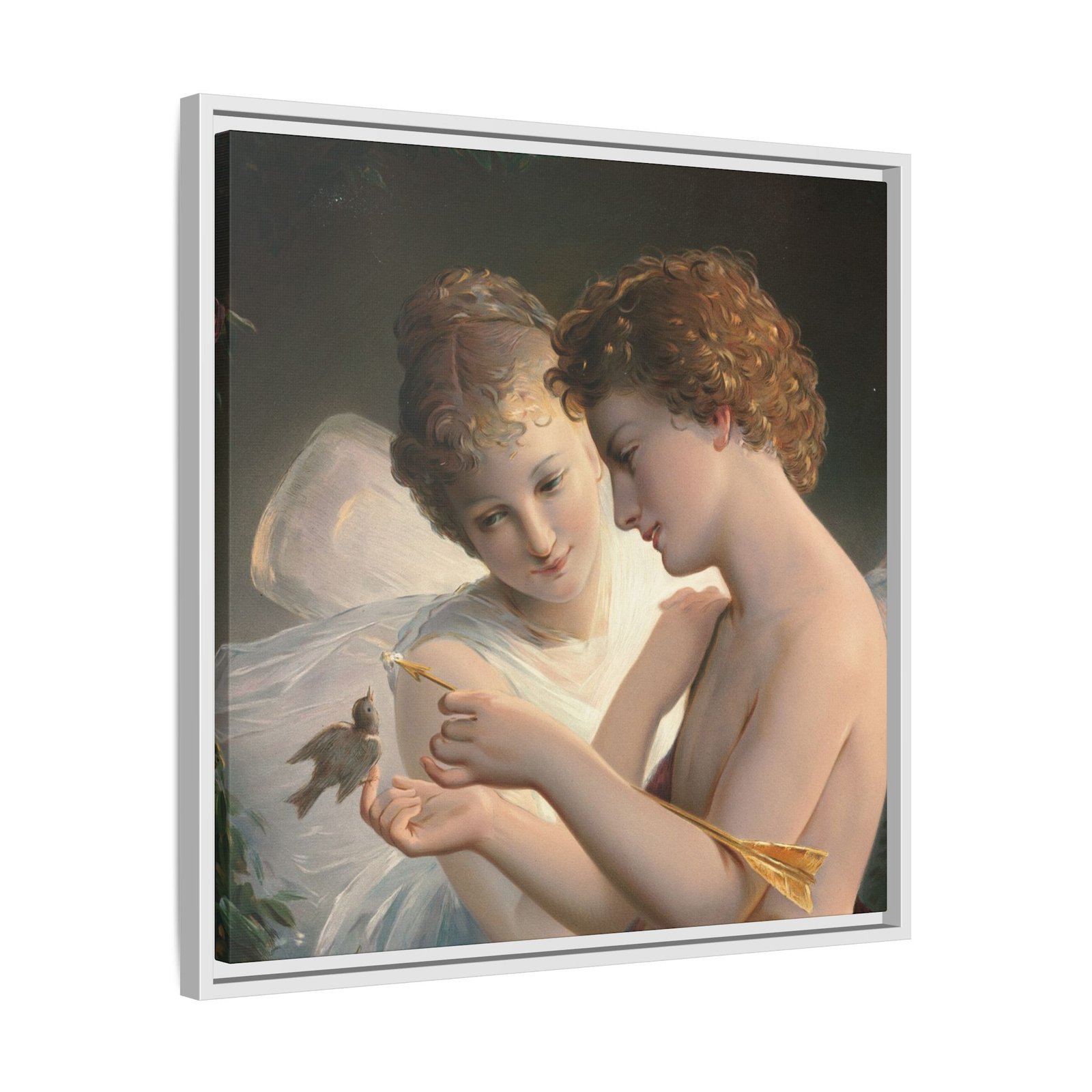 Две крылатые фигуры нежно держат маленькую птицу среди пышной зелени и цветущих роз. Их мягкие выражения лиц и лёгкие, струящиеся одежды создают спокойную и интимную атмосферу.