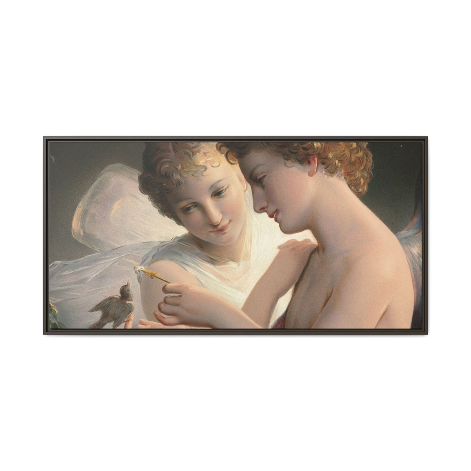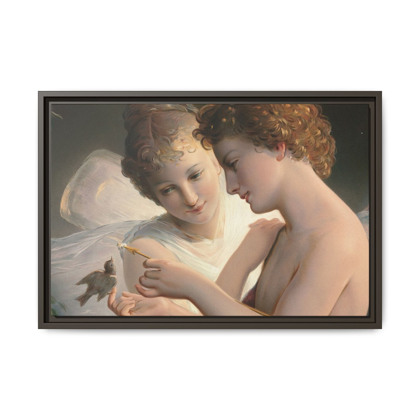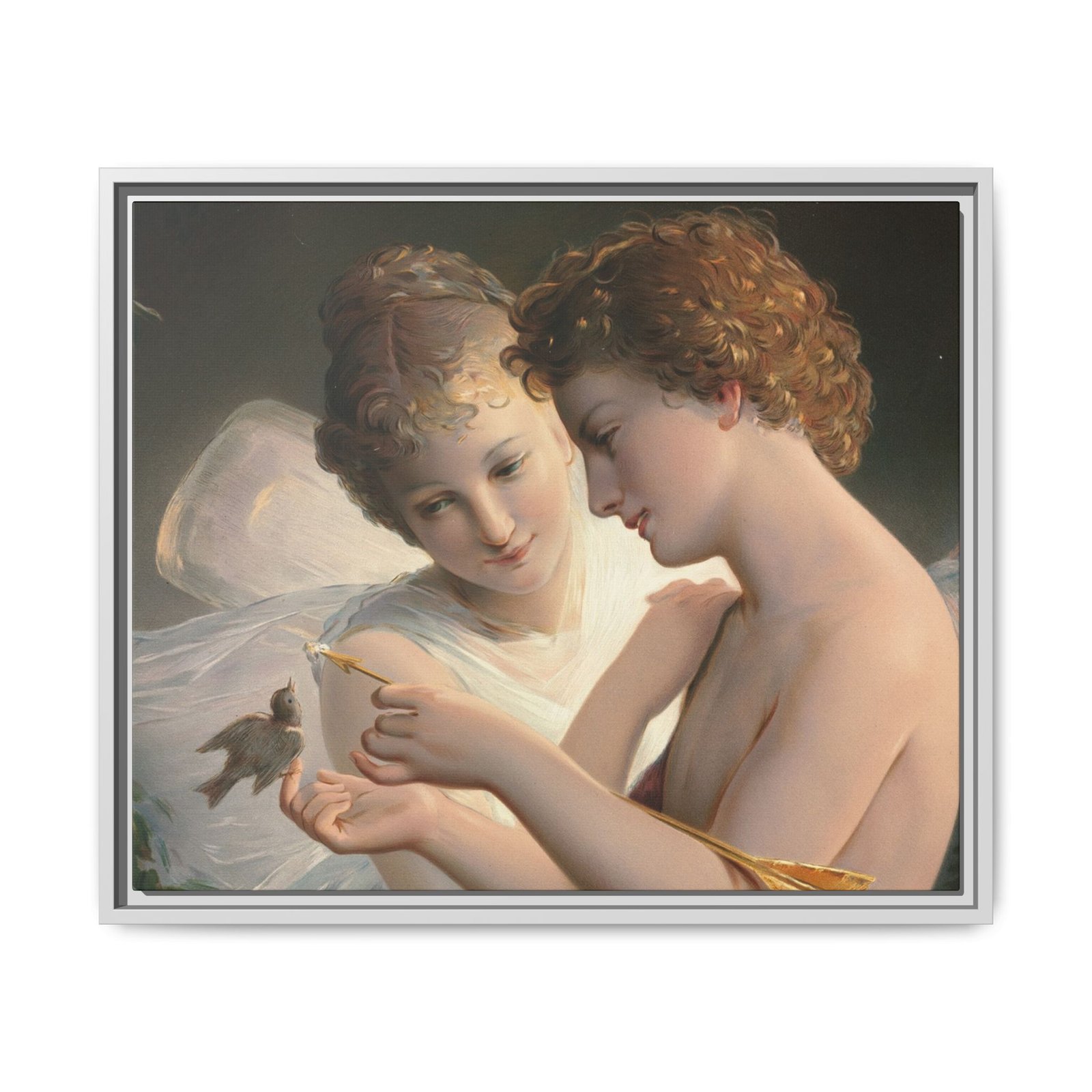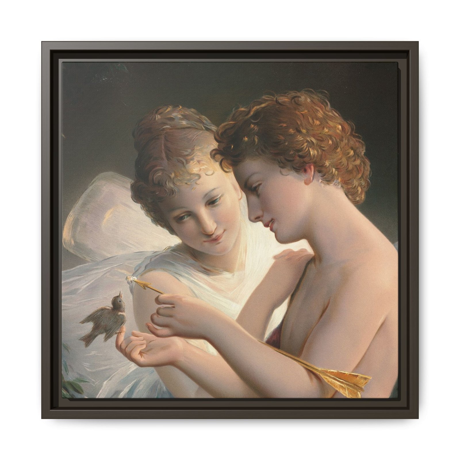 Две крылатые фигуры нежно держат маленькую птицу среди пышной зелени и цветущих роз. Их мягкие выражения лиц и лёгкие, струящиеся одежды создают спокойную и интимную атмосферу.