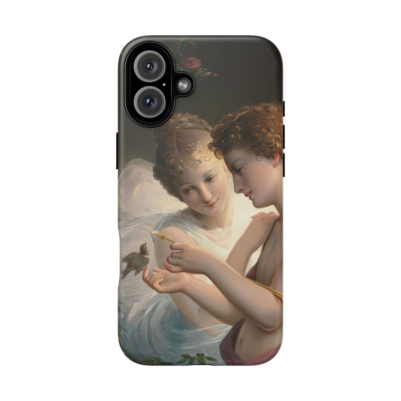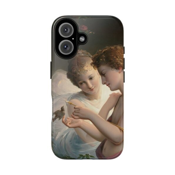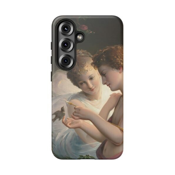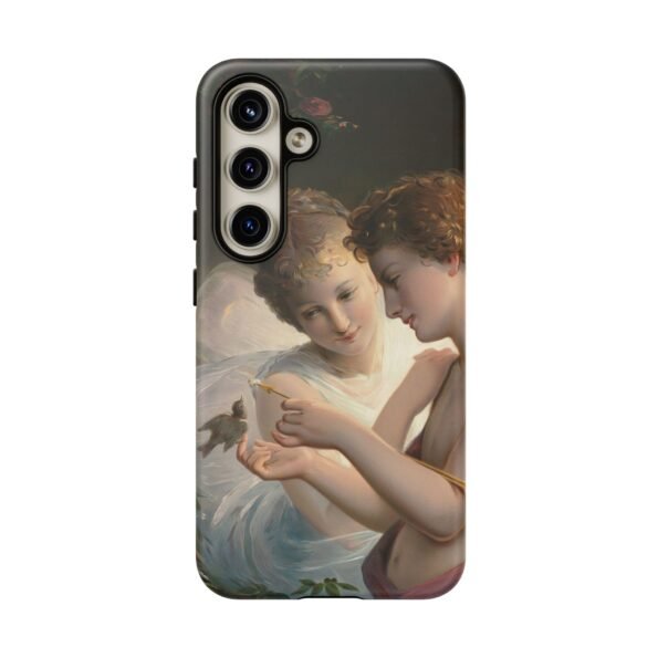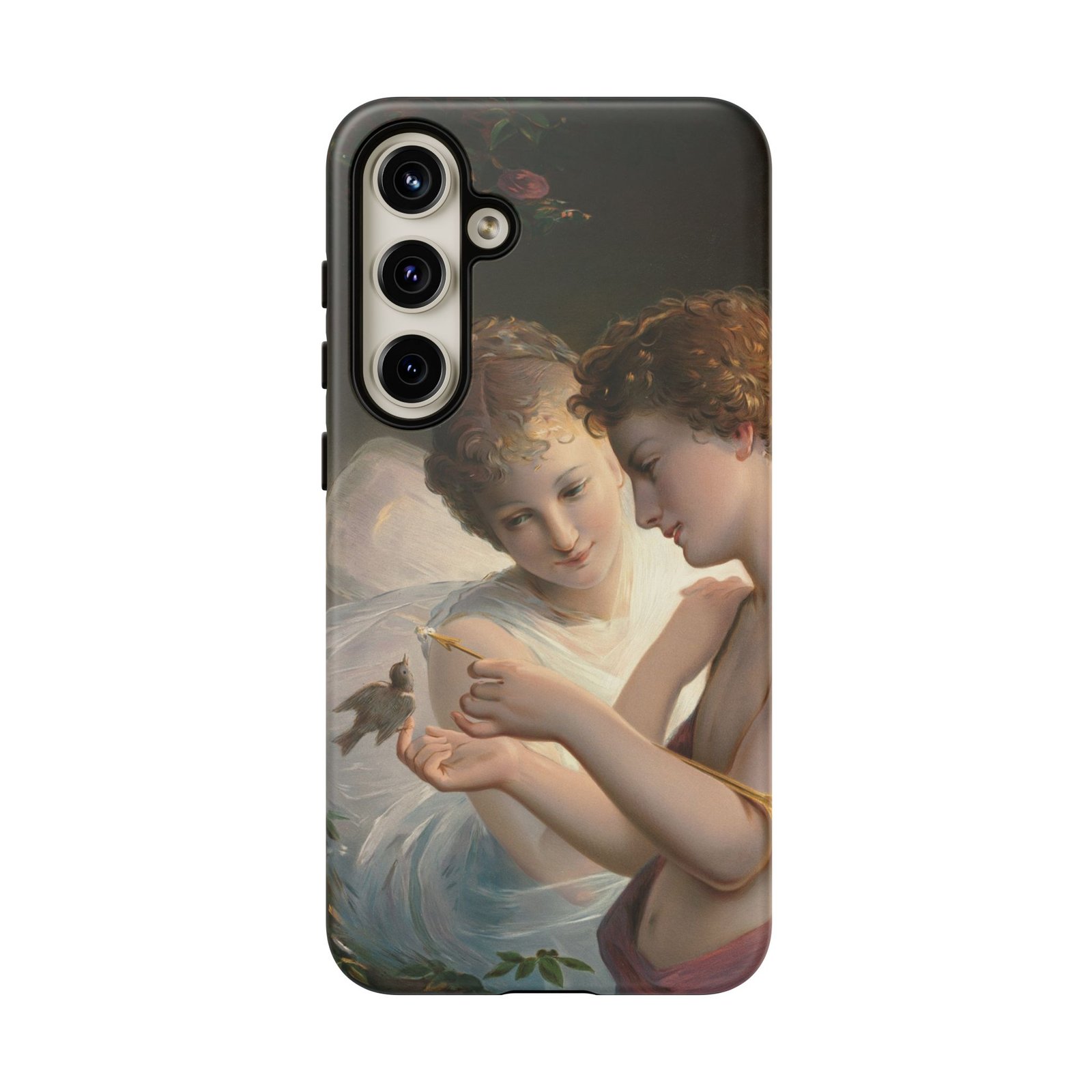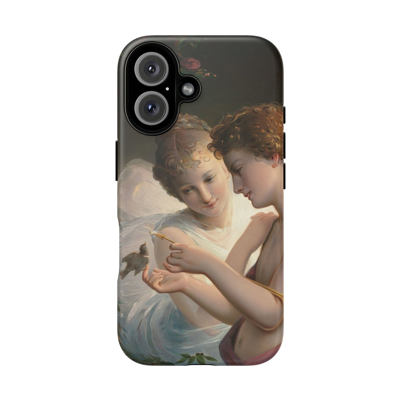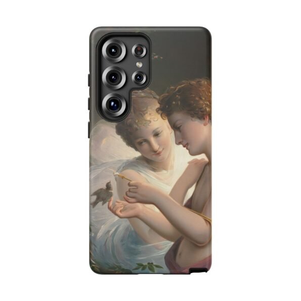 Две крылатые фигуры нежно держат маленькую птицу среди пышной зелени и цветущих роз. Их мягкие выражения лиц и лёгкие, струящиеся одежды создают спокойную и интимную атмосферу.