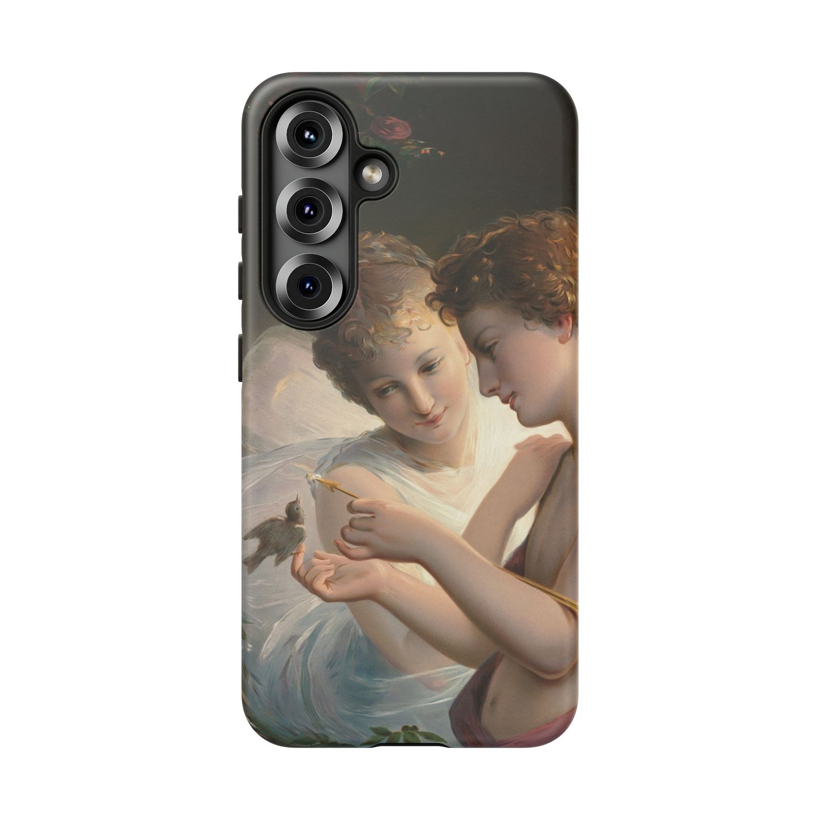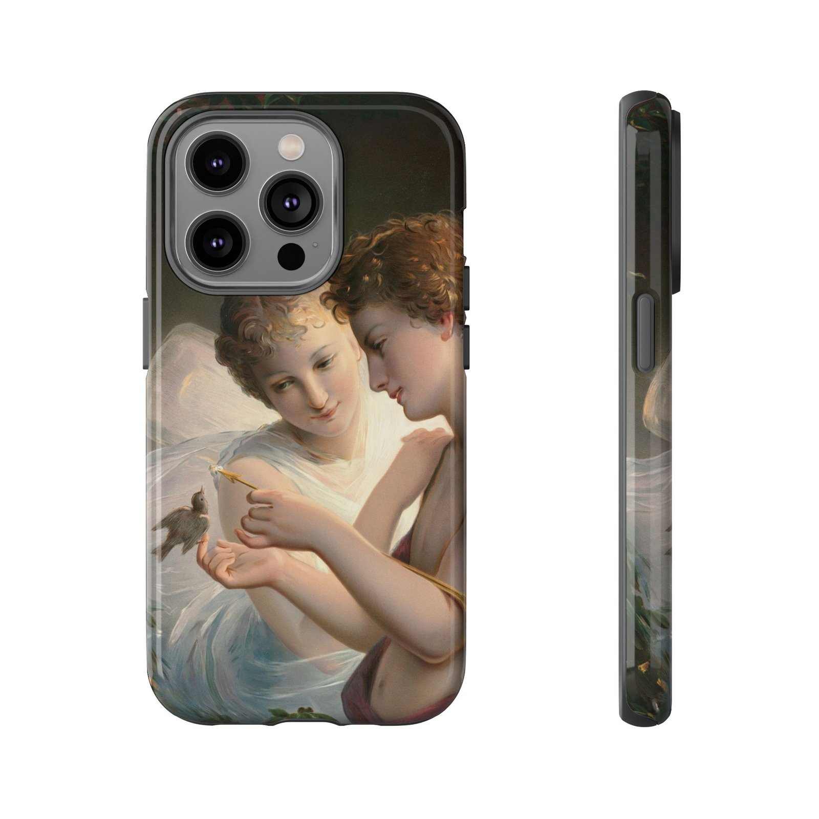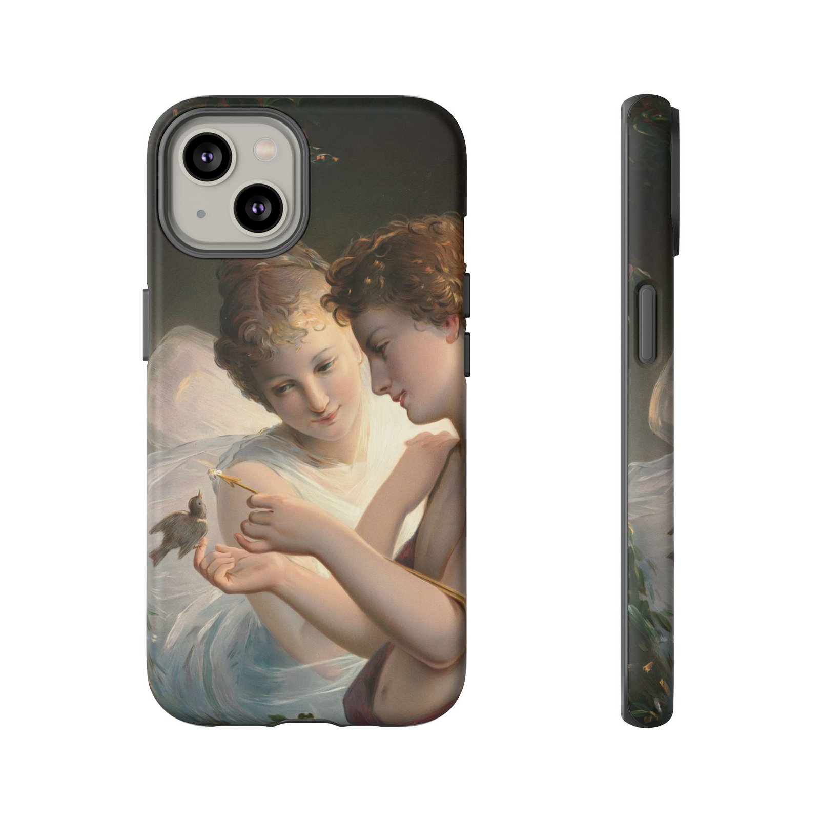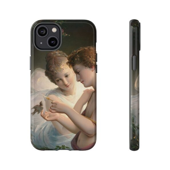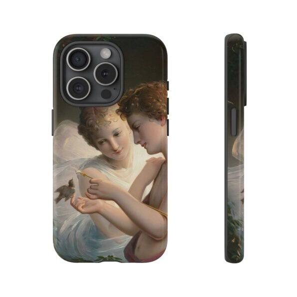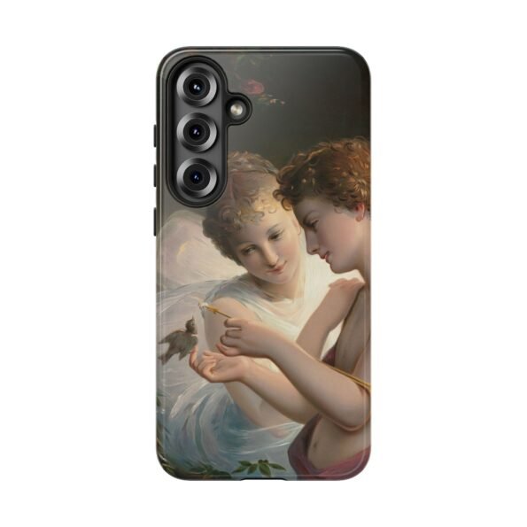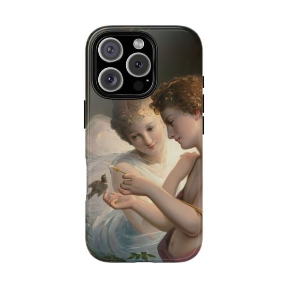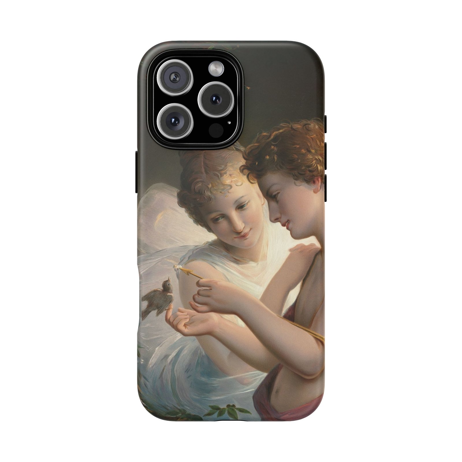 Две крылатые фигуры нежно держат маленькую птицу среди пышной зелени и цветущих роз. Их мягкие выражения лиц и лёгкие, струящиеся одежды создают спокойную и интимную атмосферу.