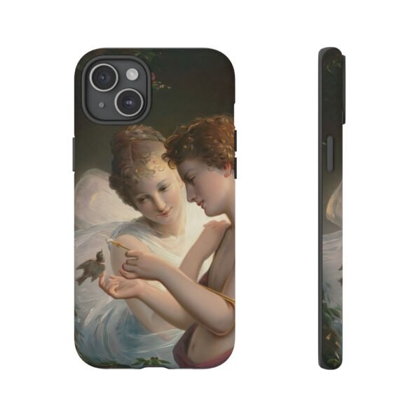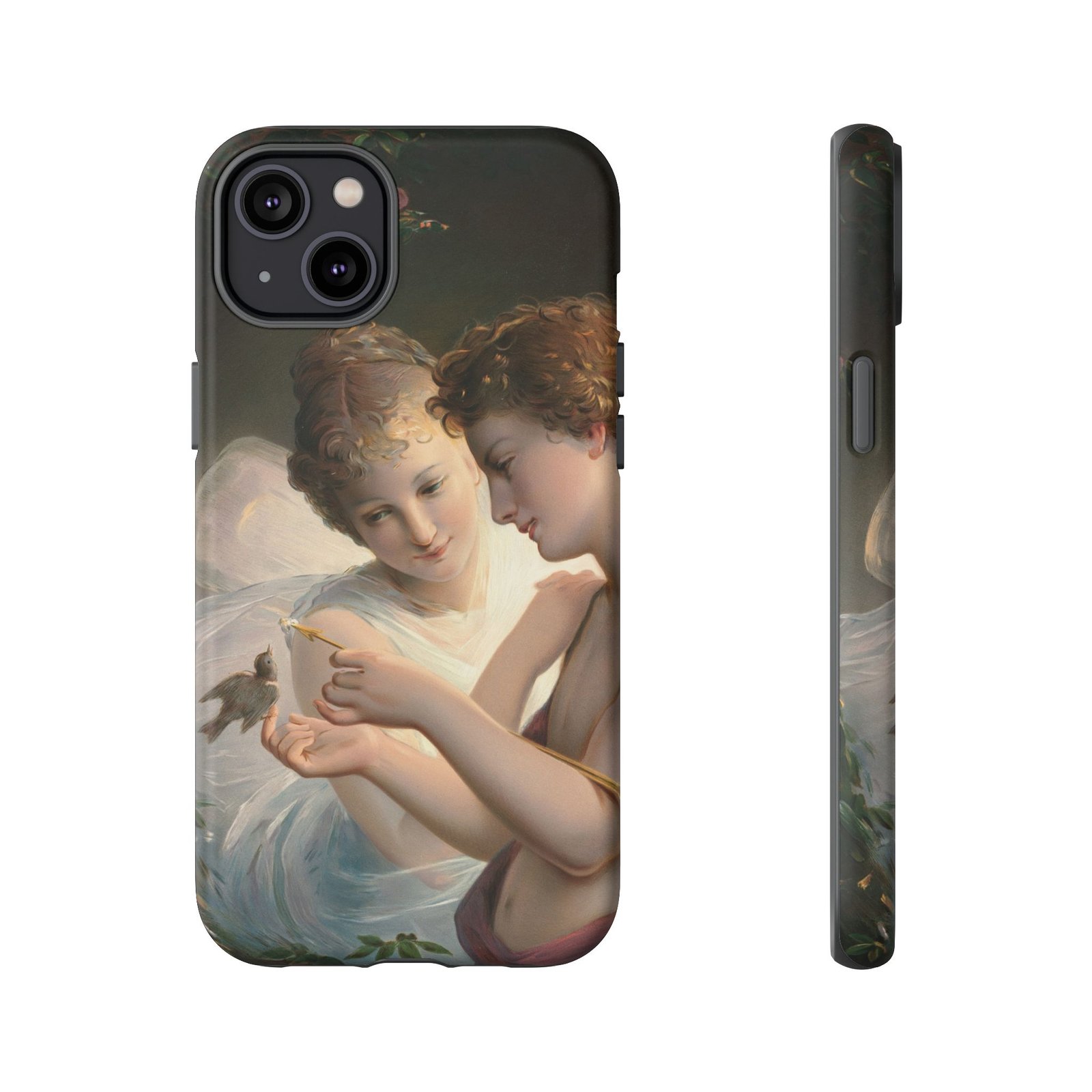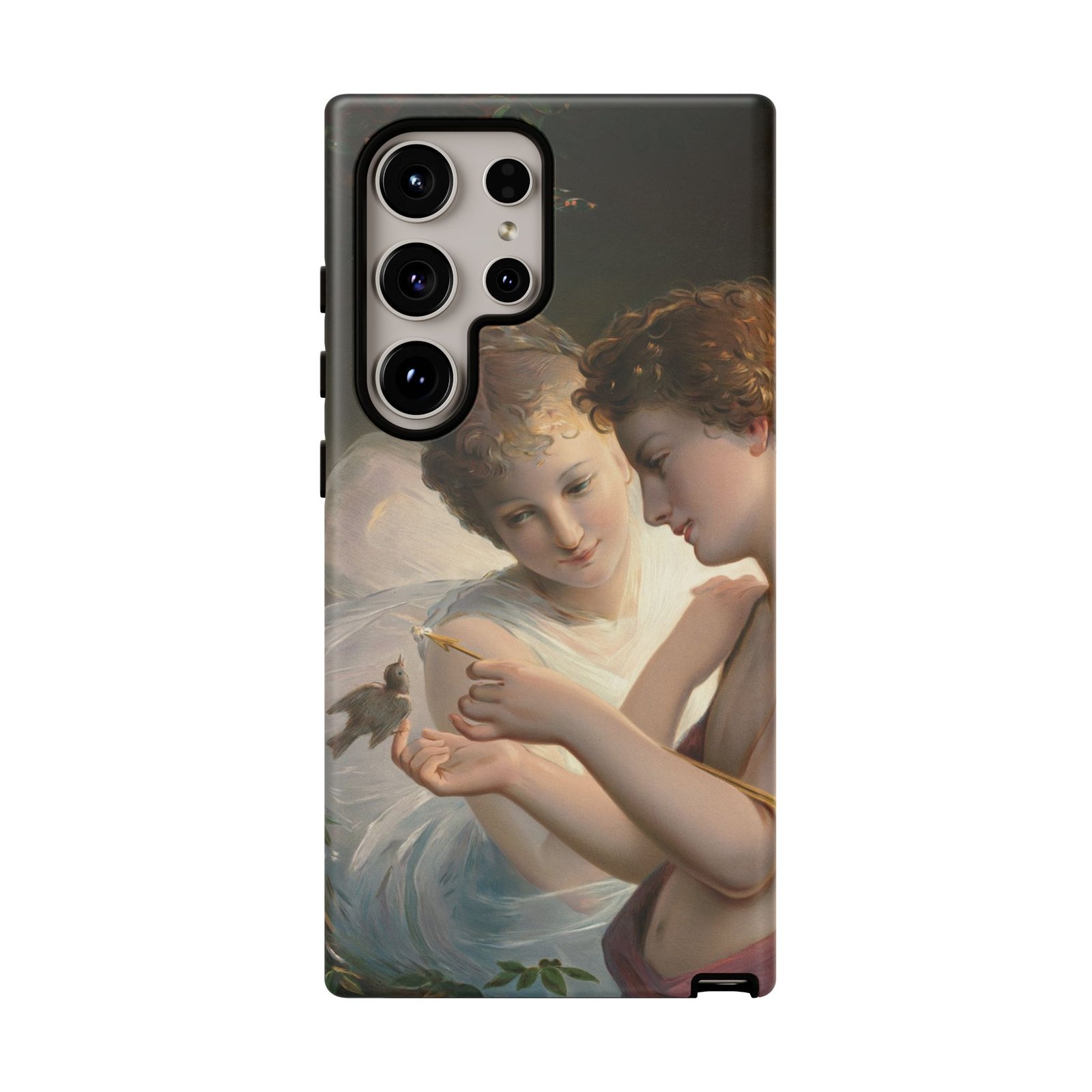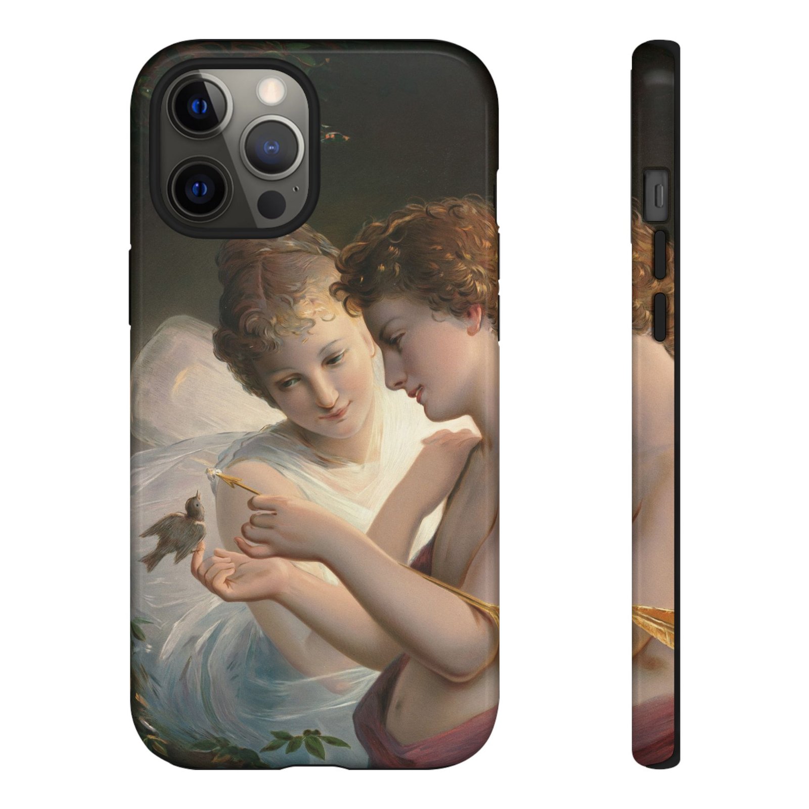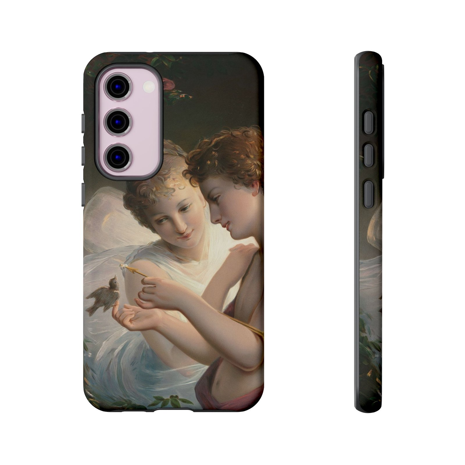 Две крылатые фигуры нежно держат маленькую птицу среди пышной зелени и цветущих роз. Их мягкие выражения лиц и лёгкие, струящиеся одежды создают спокойную и интимную атмосферу.